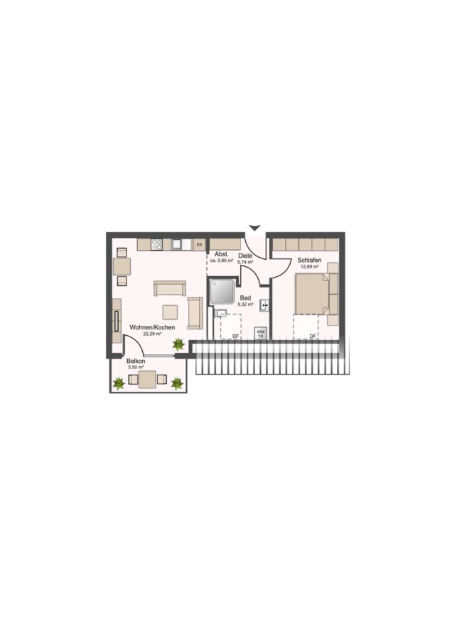 - Wohnen/Kochen: ca. 22,29 m²